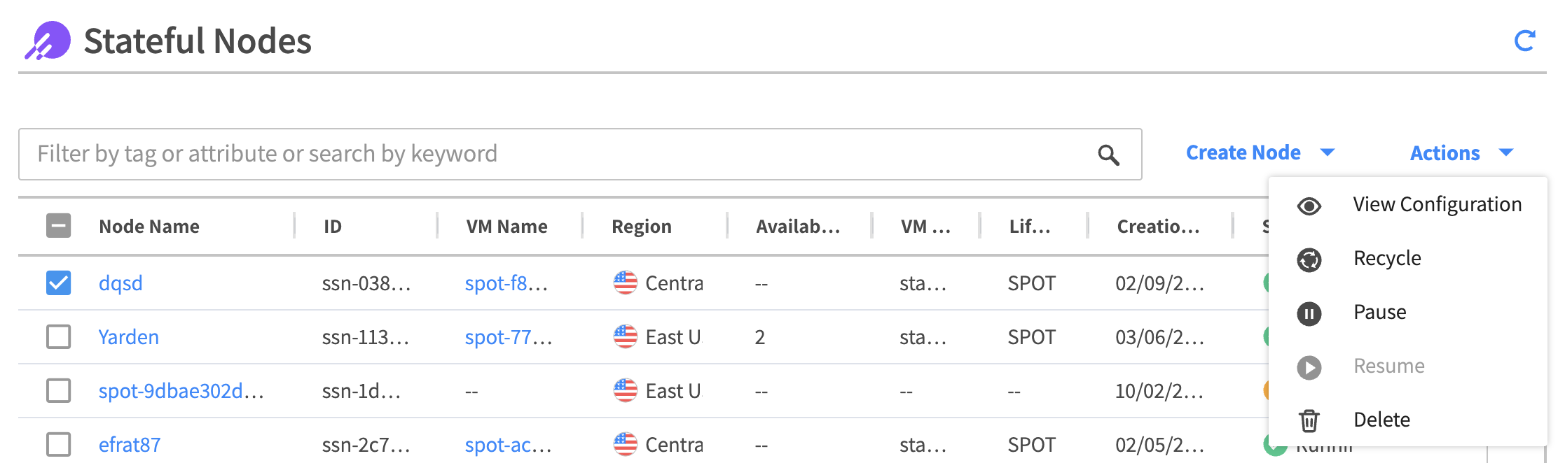 The list of stateful nodes gives you a quick view of your nodes and basic information, including: